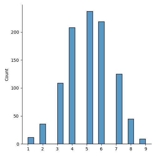 from numpy import random import matplotlib.pyplot as plt import seaborn as sns sns.displot(random.binomial(n=10, p=0.5, size=1000)) plt.show()