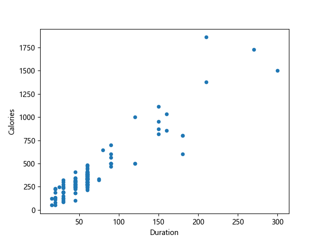 # 三行配置使编译器支持绘图功能: import sys import matplotlib matplotlib.use('Agg') import pandas as pd import matplotlib.pyplot as plt df = pd.read_csv('data.csv') # 生成 Duration 与 Calories 的散点图: df.plot(kind = 'scatter', x = 'Duration', y = 'Calories') plt.show() # 两行代码实现图形输出: plt.savefig(sys.stdout.buffer) sys.stdout.flush()