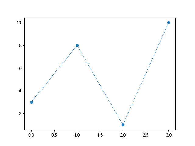 # 这三行代码使编译器能够绘图: import sys import matplotlib matplotlib.use('Agg') import matplotlib.pyplot as plt import numpy as np ypoints = np.array([3, 8, 1, 10]) # 使用圆形标记和点线样式绘制 plt.plot(ypoints, 'o:') plt.show() # 这两行代码使编译器能够输出图形: plt.savefig(sys.stdout.buffer) sys.stdout.flush()