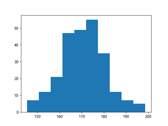 # 以下三行代码使编译器支持绘图功能: import sys import matplotlib matplotlib.use('Agg') import matplotlib.pyplot as plt import numpy as np # 生成正态分布数据: x = np.random.normal(170, 10, 250) # 均值 170,标准差 10,250 个数据点 # 绘制直方图: plt.hist(x) # 创建直方图 plt.show() # 显示图表 # 以下两行代码使编译器能够输出图形: plt.savefig(sys.stdout.buffer) sys.stdout.flush()