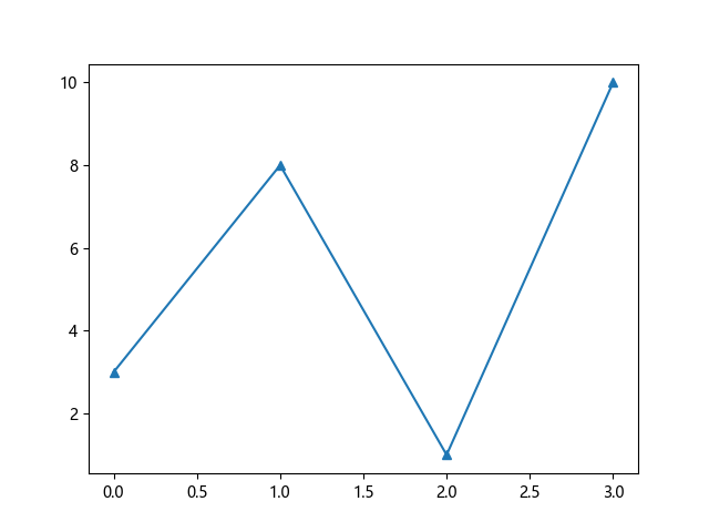 # 这三行代码使编译器能够绘图: import sys import matplotlib matplotlib.use('Agg') import matplotlib.pyplot as plt import numpy as np ypoints = np.array([3, 8, 1, 10]) # 使用上三角标记绘制 plt.plot(ypoints, marker = '^') plt.show() # 这两行代码使编译器能够输出图形: plt.savefig(sys.stdout.buffer) sys.stdout.flush()