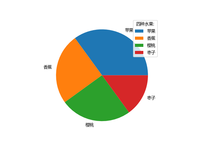 # 以下三行代码使编译器支持绘图功能: import sys import matplotlib matplotlib.use('Agg') import matplotlib.pyplot as plt import numpy as np # 准备饼图数据: y = np.array([35, 25, 25, 15]) # 各水果对应的数值 mylabels = ["苹果", "香蕉", "樱桃", "枣子"] # 水果名称标签 # 绘制饼图: plt.pie(y, labels = mylabels) # 创建带标签的饼图 plt.legend(title = "四种水果:") # 添加图例并设置标题 plt.show() # 以下两行代码使编译器能够输出图形: plt.savefig(sys.stdout.buffer) sys.stdout.flush()