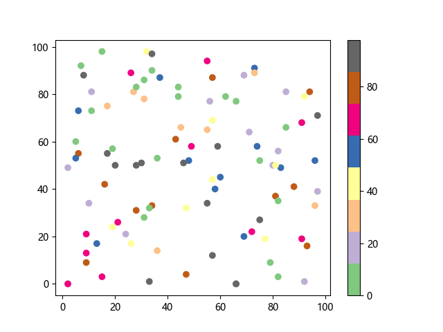 # 这三行代码使编译器能够绘图: import sys import matplotlib matplotlib.use('Agg') import matplotlib.pyplot as plt import numpy as np x = np.random.randint(100, size=(100)) y = np.random.randint(100, size=(100)) colors = np.random.randint(100, size=(100)) # 使用强调色系绘制散点图: plt.scatter(x, y, c=colors, cmap='Accent') plt.colorbar() plt.show() # 这两行代码使编译器能够输出图形: plt.savefig(sys.stdout.buffer) sys.stdout.flush()