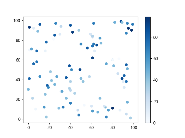 # 这三行代码使编译器能够绘图: import sys import matplotlib matplotlib.use('Agg') import matplotlib.pyplot as plt import numpy as np x = np.random.randint(100, size=(100)) y = np.random.randint(100, size=(100)) colors = np.random.randint(100, size=(100)) # 使用蓝色渐变绘制散点图: plt.scatter(x, y, c=colors, cmap='Blues') plt.colorbar() # 显示颜色条 plt.show() # 显示图形 # 这两行代码使编译器能够输出图形: plt.savefig(sys.stdout.buffer) sys.stdout.flush()