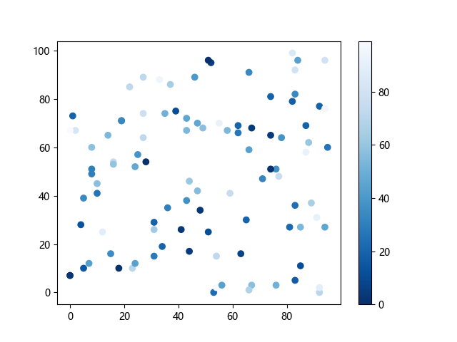 # 这三行代码使编译器能够绘图: import sys import matplotlib matplotlib.use('Agg') import matplotlib.pyplot as plt import numpy as np x = np.random.randint(100, size=(100)) y = np.random.randint(100, size=(100)) colors = np.random.randint(100, size=(100)) # 使用反向蓝色渐变绘制散点图: plt.scatter(x, y, c=colors, cmap='Blues_r') plt.colorbar() # 显示颜色条 plt.show() # 显示图形 # 这两行代码使编译器能够输出图形: plt.savefig(sys.stdout.buffer) sys.stdout.flush()
