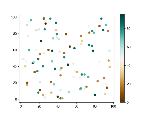 # 这三行代码使编译器能够绘图: import sys import matplotlib matplotlib.use('Agg') import matplotlib.pyplot as plt import numpy as np x = np.random.randint(100, size=(100)) y = np.random.randint(100, size=(100)) colors = np.random.randint(100, size=(100)) # 使用棕蓝绿渐变绘制散点图: plt.scatter(x, y, c=colors, cmap='BrBG') plt.colorbar() # 显示颜色条 plt.show() # 显示图形 # 这两行代码使编译器能够输出图形: plt.savefig(sys.stdout.buffer) sys.stdout.flush()