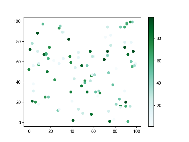 # 这三行代码使编译器能够绘图: import sys import matplotlib matplotlib.use('Agg') import matplotlib.pyplot as plt import numpy as np x = np.random.randint(100, size=(100)) y = np.random.randint(100, size=(100)) colors = np.random.randint(100, size=(100)) # 使用蓝绿色渐变绘制散点图: plt.scatter(x, y, c=colors, cmap='BuGn') plt.colorbar() # 显示颜色条 plt.show() # 显示图形 # 这两行代码使编译器能够输出图形: plt.savefig(sys.stdout.buffer) sys.stdout.flush()