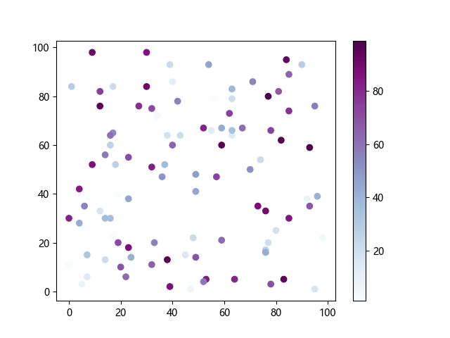 # 这三行代码使编译器能够绘图: import sys import matplotlib matplotlib.use('Agg') import matplotlib.pyplot as plt import numpy as np x = np.random.randint(100, size=(100)) y = np.random.randint(100, size=(100)) colors = np.random.randint(100, size=(100)) # 使用蓝紫色渐变绘制散点图: plt.scatter(x, y, c=colors, cmap='BuPu') plt.colorbar() # 显示颜色条 plt.show() # 显示图形 # 这两行代码使编译器能够输出图形: plt.savefig(sys.stdout.buffer) sys.stdout.flush()