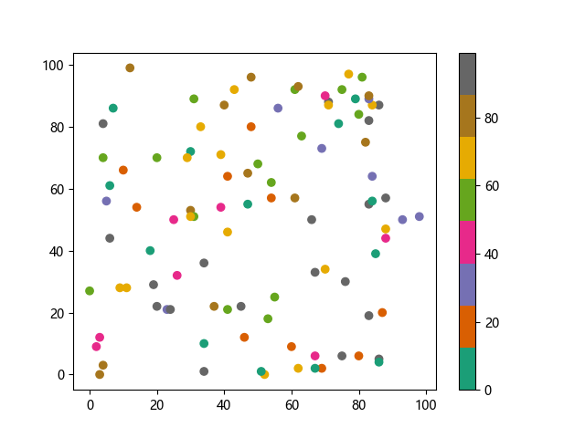 # 这三行代码使编译器能够绘图: import sys import matplotlib matplotlib.use('Agg') import matplotlib.pyplot as plt import numpy as np x = np.random.randint(100, size=(100)) y = np.random.randint(100, size=(100)) colors = np.random.randint(100, size=(100)) # 使用 Dark2 配色方案绘制散点图: plt.scatter(x, y, c=colors, cmap='Dark2') plt.colorbar() plt.show() # 这两行代码使编译器能够输出图形: plt.savefig(sys.stdout.buffer) sys.stdout.flush()