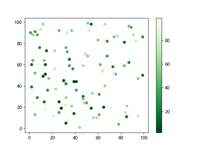 # 这三行代码使编译器能够绘图: import sys import matplotlib matplotlib.use('Agg') import matplotlib.pyplot as plt import numpy as np x = np.random.randint(100, size=(100)) y = np.random.randint(100, size=(100)) colors = np.random.randint(100, size=(100)) # 使用反向绿色渐变绘制散点图: plt.scatter(x, y, c=colors, cmap='Greens_r') plt.colorbar() plt.show() # 这两行代码使编译器能够输出图形: plt.savefig(sys.stdout.buffer) sys.stdout.flush()