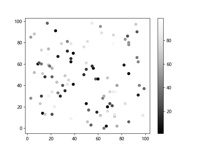 # 这三行代码使编译器能够绘图: import sys import matplotlib matplotlib.use('Agg') import matplotlib.pyplot as plt import numpy as np x = np.random.randint(100, size=(100)) y = np.random.randint(100, size=(100)) colors = np.random.randint(100, size=(100)) # 使用反向灰度渐变绘制散点图: plt.scatter(x, y, c=colors, cmap='Greys_r') plt.colorbar() plt.show() # 这两行代码使编译器能够输出图形: plt.savefig(sys.stdout.buffer) sys.stdout.flush()