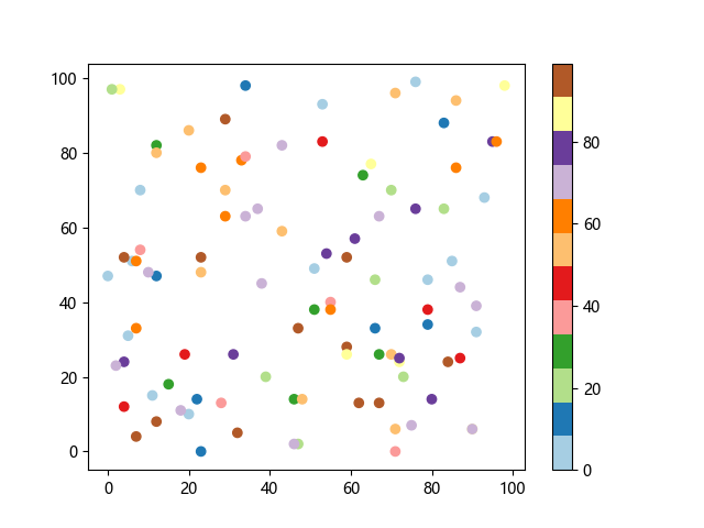 # 这三行代码使编译器能够绘图: import sys import matplotlib matplotlib.use('Agg') import matplotlib.pyplot as plt import numpy as np x = np.random.randint(100, size=(100)) y = np.random.randint(100, size=(100)) colors = np.random.randint(100, size=(100)) # 使用配对色系绘制散点图: plt.scatter(x, y, c=colors, cmap='Paired') plt.colorbar() plt.show() # 这两行代码使编译器能够输出图形: plt.savefig(sys.stdout.buffer) sys.stdout.flush()