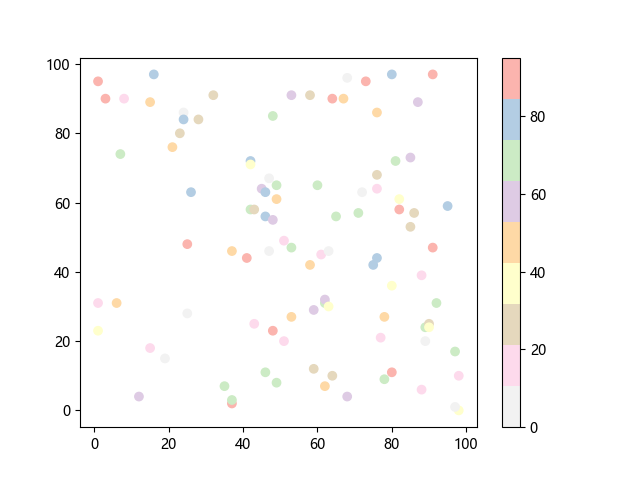 # 这三行代码使编译器能够绘图: import sys import matplotlib matplotlib.use('Agg') import matplotlib.pyplot as plt import numpy as np x = np.random.randint(100, size=(100)) y = np.random.randint(100, size=(100)) colors = np.random.randint(100, size=(100)) # 绘制反向 Pastel1 配色方案的散点图: plt.scatter(x, y, c=colors, cmap='Pastel1_r') plt.colorbar() plt.show() # 这两行代码使编译器能够输出图形: plt.savefig(sys.stdout.buffer) sys.stdout.flush()