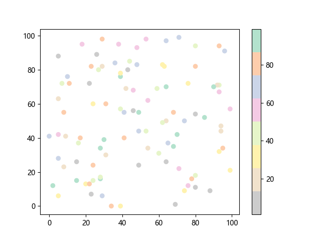 # 这三行代码使编译器能够绘图: import sys import matplotlib matplotlib.use('Agg') import matplotlib.pyplot as plt import numpy as np # 生成 100 个随机 x 坐标: x = np.random.randint(100, size=(100)) # 生成 100 个随机 y 坐标: y = np.random.randint(100, size=(100)) # 生成 100 个随机颜色值: colors = np.random.randint(100, size=(100)) # 绘制彩色散点图 plt.scatter(x, y, c=colors, cmap='Pastel2_r') plt.colorbar() # 显示颜色条 plt.show() # 显示图形 # 这两行代码使编译器能够输出图形: plt.savefig(sys.stdout.buffer) sys.stdout.flush()