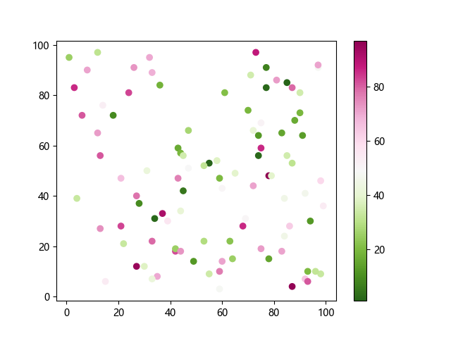 # 这三行代码使编译器能够绘图: import sys import matplotlib matplotlib.use('Agg') import matplotlib.pyplot as plt import numpy as np # 生成随机数据: x = np.random.randint(100, size=(100)) y = np.random.randint(100, size=(100)) colors = np.random.randint(100, size=(100)) # 使用 PiYG_r 配色方案绘制粉绿反向渐变色散点图: plt.scatter(x, y, c=colors, cmap='PiYG_r') plt.colorbar() # 显示颜色条 plt.show() # 显示图形 # 这两行代码使编译器能够输出图形: plt.savefig(sys.stdout.buffer) sys.stdout.flush()