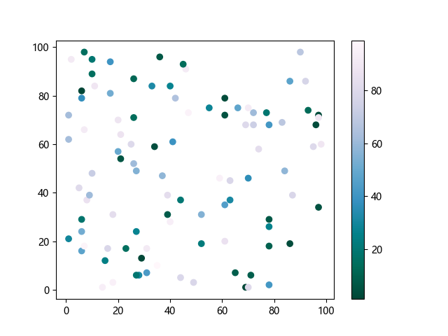 # 这三行代码使编译器能够绘图: import sys import matplotlib matplotlib.use('Agg') import matplotlib.pyplot as plt import numpy as np # 生成随机数据: x = np.random.randint(100, size=(100)) y = np.random.randint(100, size=(100)) colors = np.random.randint(100, size=(100)) # 使用 PuBuGn_r 配色方案绘制紫蓝绿反向渐变色散点图: plt.scatter(x, y, c=colors, cmap='PuBuGn_r') plt.colorbar() # 显示颜色条 plt.show() # 显示图形 # 这两行代码使编译器能够输出图形: plt.savefig(sys.stdout.buffer) sys.stdout.flush()