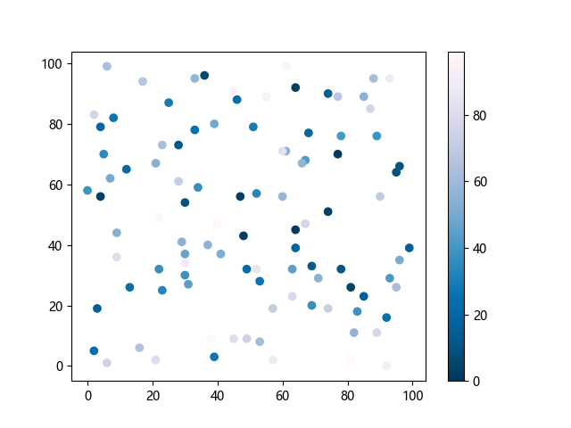 # 这三行代码使编译器能够绘图: import sys import matplotlib matplotlib.use('Agg') import matplotlib.pyplot as plt import numpy as np # 生成随机数据: x = np.random.randint(100, size=(100)) y = np.random.randint(100, size=(100)) colors = np.random.randint(100, size=(100)) # 使用 PuBu_r 配色方案绘制紫蓝色反向渐变色散点图: plt.scatter(x, y, c=colors, cmap='PuBu_r') plt.colorbar() # 显示颜色条 plt.show() # 显示图形 # 这两行代码使编译器能够输出图形: plt.savefig(sys.stdout.buffer) sys.stdout.flush()