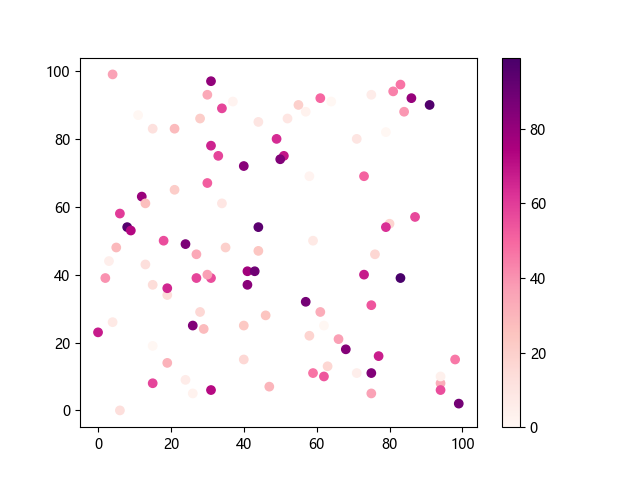 # 这三行代码使编译器能够绘图: import sys import matplotlib matplotlib.use('Agg') import matplotlib.pyplot as plt import numpy as np # 生成随机数据 x = np.random.randint(100, size=(100)) y = np.random.randint(100, size=(100)) colors = np.random.randint(100, size=(100)) # 使用 RdPu 配色方案绘制红紫色渐变色散点图: plt.scatter(x, y, c=colors, cmap='RdPu') plt.colorbar() # 显示颜色条 plt.show() # 显示图形 # 这两行代码使编译器能够输出图形: plt.savefig(sys.stdout.buffer) sys.stdout.flush()
