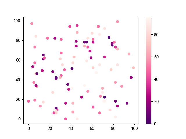 # 这三行代码使编译器能够绘图: import sys import matplotlib matplotlib.use('Agg') import matplotlib.pyplot as plt import numpy as np # 生成随机数据: x = np.random.randint(100, size=(100)) y = np.random.randint(100, size=(100)) colors = np.random.randint(100, size=(100)) # 使用 RdPu_r 配色方案绘制红紫色反向渐变色散点图: plt.scatter(x, y, c=colors, cmap='RdPu_r') plt.colorbar() # 显示颜色条 plt.show() # 显示图形 # 这两行代码使编译器能够输出图形: plt.savefig(sys.stdout.buffer) sys.stdout.flush()