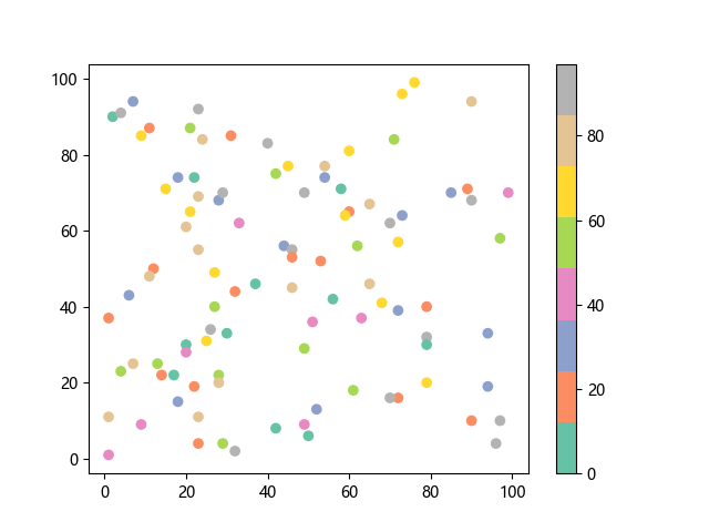 # 这三行代码使编译器能够绘图: import sys import matplotlib matplotlib.use('Agg') import matplotlib.pyplot as plt import numpy as np # 生成随机数据: x = np.random.randint(100, size=(100)) y = np.random.randint(100, size=(100)) colors = np.random.randint(100, size=(100)) # 使用 Set2 (8 色调色板)配色方案绘制 Set2 离散色散点图: plt.scatter(x, y, c=colors, cmap='Set2') plt.colorbar() # 显示颜色条 plt.show() # 显示图形 # 这两行代码使编译器能够输出图形: plt.savefig(sys.stdout.buffer) sys.stdout.flush()