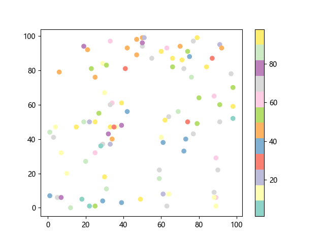# 这三行代码使编译器能够绘图: import sys import matplotlib matplotlib.use('Agg') import matplotlib.pyplot as plt import numpy as np # 生成随机数据: x = np.random.randint(100, size=(100)) y = np.random.randint(100, size=(100)) colors = np.random.randint(100, size=(100)) # 使用 Set3 (12 色调色板)配色方案绘制 Set3 离散色散点图: plt.scatter(x, y, c=colors, cmap='Set3') plt.colorbar() # 显示颜色条 plt.show() # 显示图形 # 这两行代码使编译器能够输出图形: plt.savefig(sys.stdout.buffer) sys.stdout.flush()
