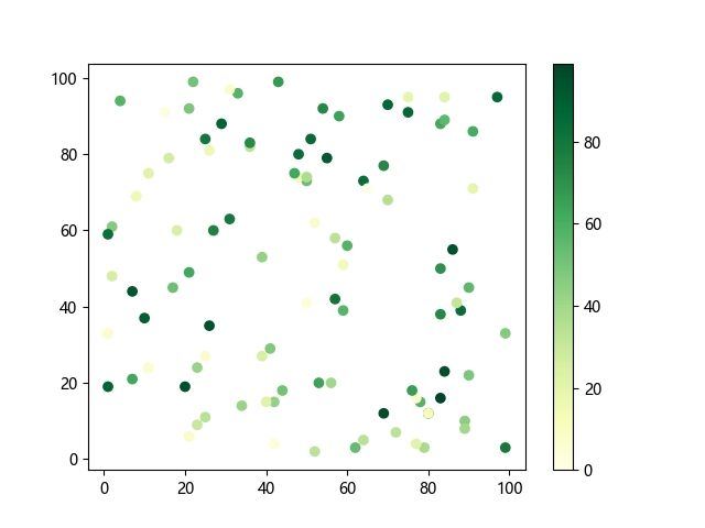 # 这三行代码使编译器能够绘图: import sys import matplotlib matplotlib.use('Agg') import matplotlib.pyplot as plt import numpy as np # 生成随机数据: x = np.random.randint(100, size=(100)) y = np.random.randint(100, size=(100)) colors = np.random.randint(100, size=(100)) # 使用 YlGn (黄-绿渐变)配色方案绘制散点图: plt.scatter(x, y, c=colors, cmap='YlGn') plt.colorbar() # 显示颜色条 plt.show() # 显示图形 # 这两行代码使编译器能够输出图形: plt.savefig(sys.stdout.buffer) sys.stdout.flush()