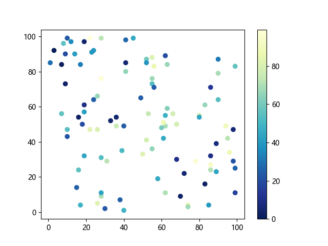 # 这三行代码使编译器能够绘图: import sys import matplotlib matplotlib.use('Agg') import matplotlib.pyplot as plt import numpy as np # 生成随机数据点: x = np.random.randint(100, size=(100)) y = np.random.randint(100, size=(100)) colors = np.random.randint(100, size=(100)) # 使用 YlGnBu_r (黄-绿-蓝反向渐变)配色方案绘制散点图: plt.scatter(x, y, c=colors, cmap='YlGnBu_r') plt.colorbar() # 显示颜色条 plt.show() # 显示图形 # 这两行代码使编译器能够输出图形: plt.savefig(sys.stdout.buffer) sys.stdout.flush()