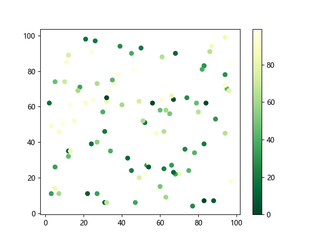 # 这三行代码使编译器能够绘图: import sys import matplotlib matplotlib.use('Agg') import matplotlib.pyplot as plt import numpy as np # 生成随机数据: x = np.random.randint(100, size=(100)) y = np.random.randint(100, size=(100)) colors = np.random.randint(100, size=(100)) # 使用YlGn_r(黄-绿反向渐变)配色方案绘制散点图: plt.scatter(x, y, c=colors, cmap='YlGn_r') plt.colorbar() # 显示颜色条 plt.show() # 显示图形 # 这两行代码使编译器能够输出图形: plt.savefig(sys.stdout.buffer) sys.stdout.flush()