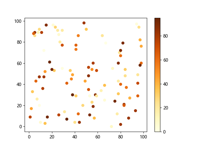 # 这三行代码使编译器能够绘图: import sys import matplotlib matplotlib.use('Agg') import matplotlib.pyplot as plt import numpy as np # 生成随机数据: x = np.random.randint(100, size=(100)) y = np.random.randint(100, size=(100)) colors = np.random.randint(100, size=(100)) # 使用 YlOrBr (黄-橙-棕渐变)配色方案绘制黄橙棕渐变散点图: plt.scatter(x, y, c=colors, cmap='YlOrBr') plt.colorbar() # 显示颜色条 plt.show() # 显示图形 # 这两行代码使编译器能够输出图形: plt.savefig(sys.stdout.buffer) sys.stdout.flush()