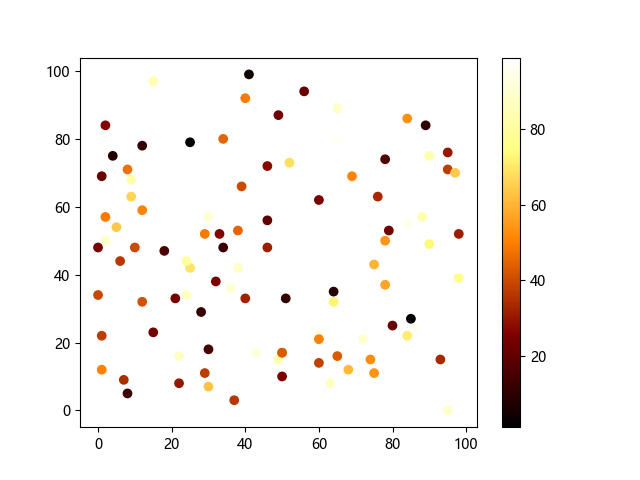 # 这三行代码使编译器能够绘图: import sys import matplotlib matplotlib.use('Agg') import matplotlib.pyplot as plt import numpy as np # 生成随机数据: x = np.random.randint(100, size=(100)) y = np.random.randint(100, size=(100)) colors = np.random.randint(100, size=(100)) # 使用 afmhot (热金属)配色方案绘制热金属色散点图: plt.scatter(x, y, c=colors, cmap='afmhot') plt.colorbar() # 显示颜色条 plt.show() # 显示图形 # 这两行代码使编译器能够输出图形: plt.savefig(sys.stdout.buffer) sys.stdout.flush()