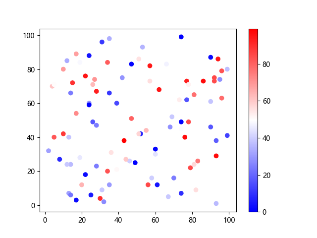 # 这三行代码使编译器能够绘图: import sys import matplotlib matplotlib.use('Agg') import matplotlib.pyplot as plt import numpy as np # 生成随机数据 x = np.random.randint(100, size=(100)) y = np.random.randint(100, size=(100)) colors = np.random.randint(100, size=(100)) # 使用 bwr 配色方案绘制蓝白红渐变色散点图: plt.scatter(x, y, c=colors, cmap='bwr') plt.colorbar() plt.show() # 这两行代码使编译器能够输出图形: plt.savefig(sys.stdout.buffer) sys.stdout.flush()