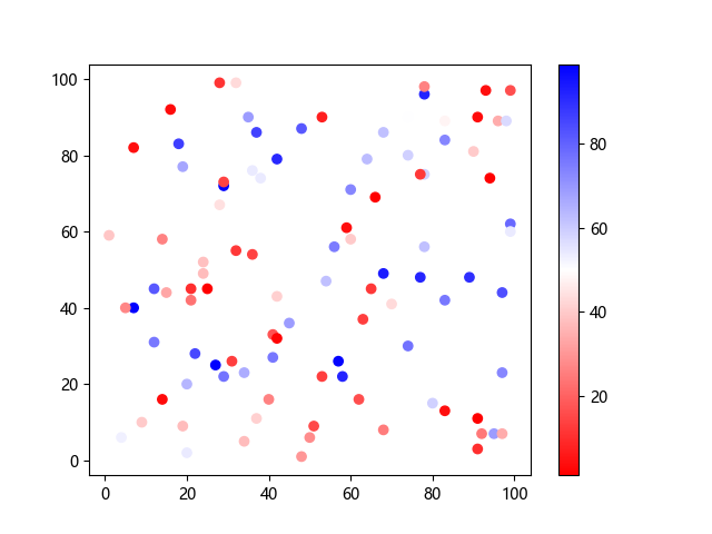 # 这三行代码使编译器能够绘图: import sys import matplotlib matplotlib.use('Agg') import matplotlib.pyplot as plt import numpy as np # 生成随机数据点 x = np.random.randint(100, size=(100)) y = np.random.randint(100, size=(100)) colors = np.random.randint(100, size=(100)) # 使用 bwr_r 配色方案绘制蓝白红反向渐变色散点图: plt.scatter(x, y, c=colors, cmap='bwr_r') plt.colorbar() plt.show() # 这两行代码使编译器能够输出图形: plt.savefig(sys.stdout.buffer) sys.stdout.flush()