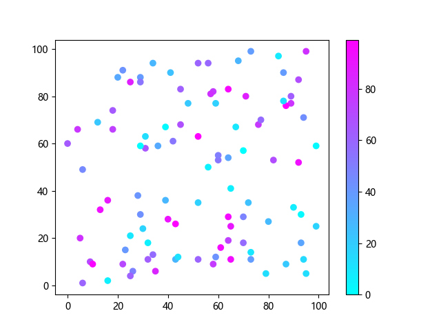 # 这三行代码使编译器能够绘图: import sys import matplotlib matplotlib.use('Agg') import matplotlib.pyplot as plt import numpy as np # 生成随机数据 x = np.random.randint(100, size=(100)) y = np.random.randint(100, size=(100)) colors = np.random.randint(100, size=(100)) # 使用 cool 配色方案绘制冷色调渐变色散点图: plt.scatter(x, y, c=colors, cmap='cool') plt.colorbar() plt.show() # 这两行代码使编译器能够输出图形: plt.savefig(sys.stdout.buffer) sys.stdout.flush()