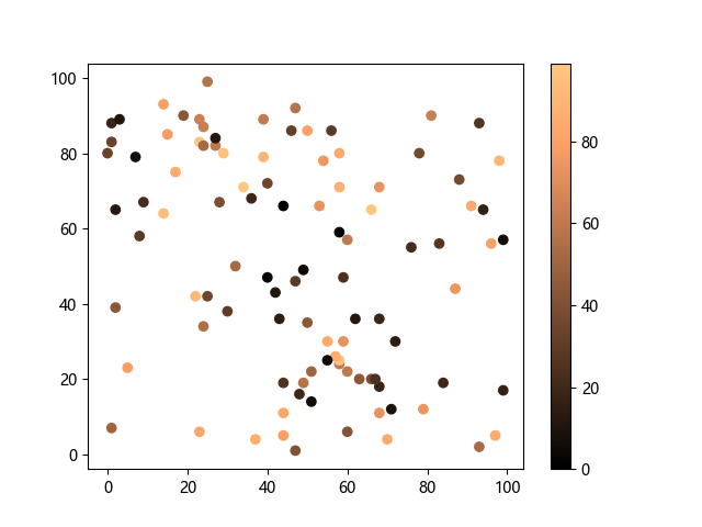 # 这三行代码使编译器能够绘图: import sys import matplotlib matplotlib.use('Agg') import matplotlib.pyplot as plt import numpy as np # 生成随机数据 x = np.random.randint(100, size=(100)) y = np.random.randint(100, size=(100)) colors = np.random.randint(100, size=(100)) # 使用 copper 配色方案绘制铜色渐变色散点图: plt.scatter(x, y, c=colors, cmap='copper') plt.colorbar() plt.show() # 这两行代码使编译器能够输出图形: plt.savefig(sys.stdout.buffer) sys.stdout.flush()