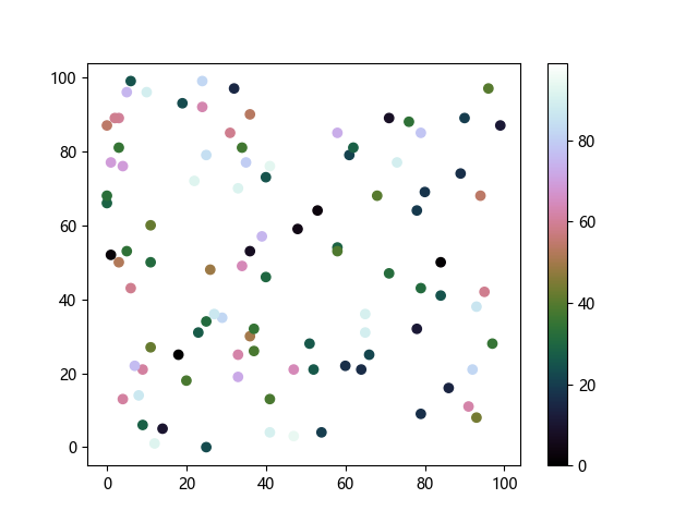 # 这三行代码使编译器能够绘图: import sys import matplotlib matplotlib.use('Agg') import matplotlib.pyplot as plt import numpy as np # 生成随机数据 x = np.random.randint(100, size=(100)) y = np.random.randint(100, size=(100)) colors = np.random.randint(100, size=(100)) # 使用 cubehelix 配色方案绘制螺旋立方体渐变色散点图: plt.scatter(x, y, c=colors, cmap='cubehelix') plt.colorbar() plt.show() # 这两行代码使编译器能够输出图形: plt.savefig(sys.stdout.buffer) sys.stdout.flush()