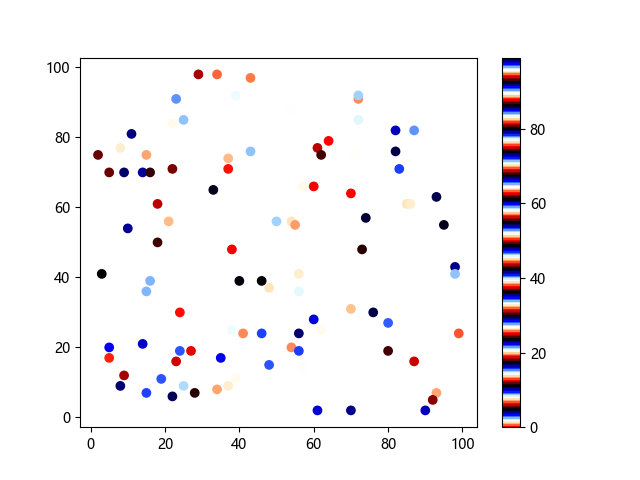 # 这三行代码使编译器能够绘图: import sys import matplotlib matplotlib.use('Agg') import matplotlib.pyplot as plt import numpy as np # 生成随机数据 x = np.random.randint(100, size=(100)) y = np.random.randint(100, size=(100)) colors = np.random.randint(100, size=(100)) # 使用 flag 配色方案绘制旗帜渐变色散点图: plt.scatter(x, y, c=colors, cmap='flag') plt.colorbar() plt.show() # 这两行代码使编译器能够输出图形: plt.savefig(sys.stdout.buffer) sys.stdout.flush()