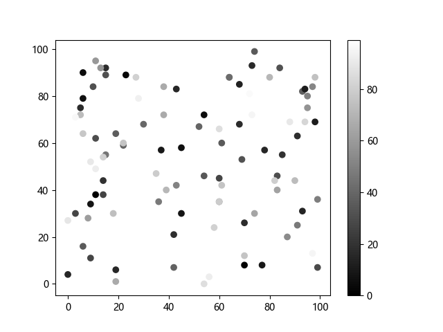 # 这三行代码使编译器能够绘图: import sys import matplotlib matplotlib.use('Agg') import matplotlib.pyplot as plt import numpy as np # 生成随机数据 x = np.random.randint(100, size=(100)) y = np.random.randint(100, size=(100)) colors = np.random.randint(100, size=(100)) # 使用 gist_gray 配色方案绘制灰度渐变色散点图: plt.scatter(x, y, c=colors, cmap='gist_gray') plt.colorbar() plt.show() # 这两行代码使编译器能够输出图形: plt.savefig(sys.stdout.buffer) sys.stdout.flush()