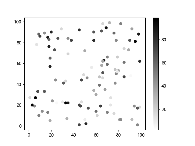 # 这三行代码使编译器能够绘图: import sys import matplotlib matplotlib.use('Agg') import matplotlib.pyplot as plt import numpy as np # 生成随机数据点 x = np.random.randint(100, size=(100)) y = np.random.randint(100, size=(100)) colors = np.random.randint(100, size=(100)) # 使用 gist_gray_r 配色方案绘制灰度反向渐变色散点图: plt.scatter(x, y, c=colors, cmap='gist_gray_r') plt.colorbar() plt.show() # 这两行代码使编译器能够输出图形: plt.savefig(sys.stdout.buffer) sys.stdout.flush()