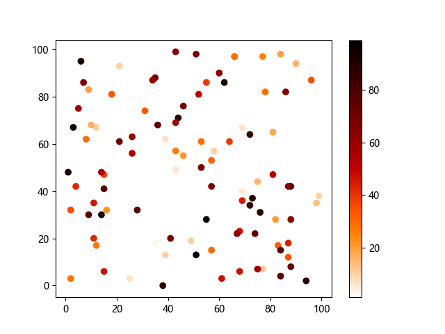 # 这三行代码使编译器能够绘图: import sys import matplotlib matplotlib.use('Agg') import matplotlib.pyplot as plt import numpy as np # 生成随机数据点 x = np.random.randint(100, size=(100)) y = np.random.randint(100, size=(100)) colors = np.random.randint(100, size=(100)) # 使用 gist_heat_r 配色方案绘制热力图反向渐变色散点图: plt.scatter(x, y, c=colors, cmap='gist_heat_r') plt.colorbar() plt.show() # 这两行代码使编译器能够输出图形: plt.savefig(sys.stdout.buffer) sys.stdout.flush()