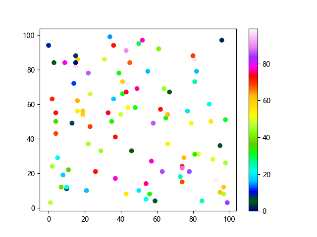# 这三行代码使编译器能够绘图: import sys import matplotlib matplotlib.use('Agg') import matplotlib.pyplot as plt import numpy as np # 生成随机数据 x = np.random.randint(100, size=(100)) y = np.random.randint(100, size=(100)) colors = np.random.randint(100, size=(100)) # 使用 gist_ncar 配色方案绘制NCAR渐变色散点图: plt.scatter(x, y, c=colors, cmap='gist_ncar') plt.colorbar() plt.show() # 这两行代码使编译器能够输出图形: plt.savefig(sys.stdout.buffer) sys.stdout.flush()