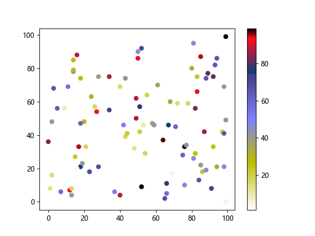 # 这三行代码使编译器能够绘图: import sys import matplotlib matplotlib.use('Agg') import matplotlib.pyplot as plt import numpy as np # 生成随机数据点 x = np.random.randint(100, size=(100)) y = np.random.randint(100, size=(100)) colors = np.random.randint(100, size=(100)) # 使用 gist_stern_r 配色方案绘制星云反向渐变色散点图: plt.scatter(x, y, c=colors, cmap='gist_stern_r') plt.colorbar() plt.show() # 这两行代码使编译器能够输出图形: plt.savefig(sys.stdout.buffer) sys.stdout.flush()
