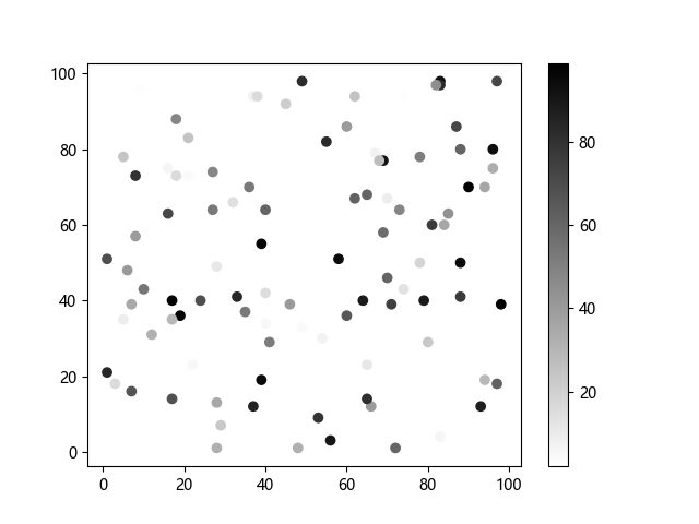 # 这三行代码使编译器能够绘图: import sys import matplotlib matplotlib.use('Agg') import matplotlib.pyplot as plt import numpy as np # 生成随机数据 x = np.random.randint(100, size=(100)) y = np.random.randint(100, size=(100)) colors = np.random.randint(100, size=(100)) # 使用 gist_yarg 配色方案绘制灰度渐变色散点图: plt.scatter(x, y, c=colors, cmap='gist_yarg') plt.colorbar() plt.show() # 这两行代码使编译器能够输出图形: plt.savefig(sys.stdout.buffer) sys.stdout.flush()