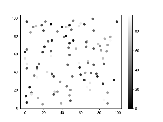 # 这三行代码使编译器能够绘图: import sys import matplotlib matplotlib.use('Agg') import matplotlib.pyplot as plt import numpy as np # 生成随机数据点 x = np.random.randint(100, size=(100)) y = np.random.randint(100, size=(100)) colors = np.random.randint(100, size=(100)) # 使用 gist_yarg_r 配色方案绘制灰度反向渐变色散点图: plt.scatter(x, y, c=colors, cmap='gist_yarg_r') plt.colorbar() plt.show() # 这两行代码使编译器能够输出图形: plt.savefig(sys.stdout.buffer) sys.stdout.flush()