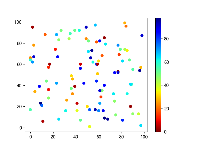 # 这三行代码使编译器能够绘图: import sys import matplotlib matplotlib.use('Agg') import matplotlib.pyplot as plt import numpy as np # 生成随机数据点 x = np.random.randint(100, size=(100)) y = np.random.randint(100, size=(100)) colors = np.random.randint(100, size=(100)) # 使用 jet_r 配色方案绘制 Jet 反向渐变色散点图: plt.scatter(x, y, c=colors, cmap='jet_r') plt.colorbar() plt.show() # 这两行代码使编译器能够输出图形: plt.savefig(sys.stdout.buffer) sys.stdout.flush()