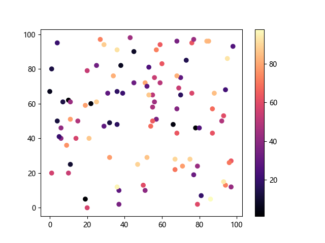 # 这三行代码使编译器能够绘图: import sys import matplotlib matplotlib.use('Agg') import matplotlib.pyplot as plt import numpy as np # 生成随机数据 x = np.random.randint(100, size=(100)) y = np.random.randint(100, size=(100)) colors = np.random.randint(100, size=(100)) # 使用 magma 配色方案绘制岩浆渐变色散点图: plt.scatter(x, y, c=colors, cmap='magma') plt.colorbar() plt.show() # 这两行代码使编译器能够输出图形: plt.savefig(sys.stdout.buffer) sys.stdout.flush()