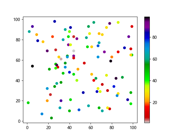 #Three lines to make our compiler able to draw: import sys import matplotlib matplotlib.use('Agg') import matplotlib.pyplot as plt import numpy as np x = np.random.randint(100, size=(100)) y = np.random.randint(100, size=(100)) colors = np.random.randint(100, size=(100)) plt.scatter(x, y, c=colors, cmap='nipy_spectral_r') plt.colorbar() plt.show() #Two lines to make our compiler able to draw: plt.savefig(sys.stdout.buffer) sys.stdout.flush()
