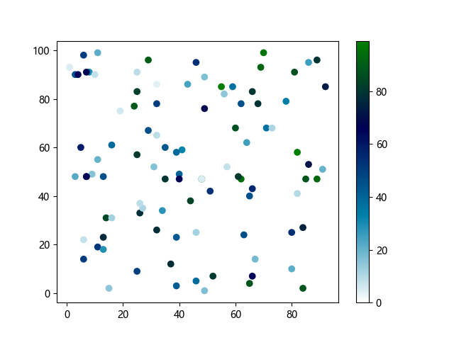 # 这三行代码使编译器能够绘图: import sys import matplotlib matplotlib.use('Agg') import matplotlib.pyplot as plt import numpy as np # 生成随机数据点 x = np.random.randint(100, size=(100)) y = np.random.randint(100, size=(100)) colors = np.random.randint(100, size=(100)) # 使用 ocean_r 配色方案绘制海洋色反向渐变色散点图: plt.scatter(x, y, c=colors, cmap='ocean_r') plt.colorbar() plt.show() # 这两行代码使编译器能够输出图形: plt.savefig(sys.stdout.buffer) sys.stdout.flush()