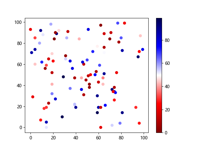 # 以下三行代码使编译器支持绘图功能: import sys import matplotlib matplotlib.use('Agg') import matplotlib.pyplot as plt import numpy as np # 生成随机数据: x = np.random.randint(100, size=(100)) y = np.random.randint(100, size=(100)) colors = np.random.randint(100, size=(100)) # 使用 seismic 反向配色方案创建散点图: plt.scatter(x, y, c=colors, cmap='seismic_r') plt.colorbar() plt.show() # 以下两行代码使编译器能够输出图形: plt.savefig(sys.stdout.buffer) sys.stdout.flush()