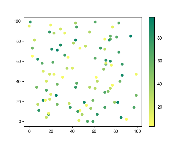 # 以下三行代码使编译器支持绘图功能: import sys import matplotlib matplotlib.use('Agg') import matplotlib.pyplot as plt import numpy as np # 生成随机数据: x = np.random.randint(100, size=(100)) y = np.random.randint(100, size=(100)) colors = np.random.randint(100, size=(100)) # 使用 summer 反向配色方案创建散点图: plt.scatter(x, y, c=colors, cmap='summer_r') plt.colorbar() plt.show() # 以下两行代码使编译器能够输出图形: plt.savefig(sys.stdout.buffer) sys.stdout.flush()