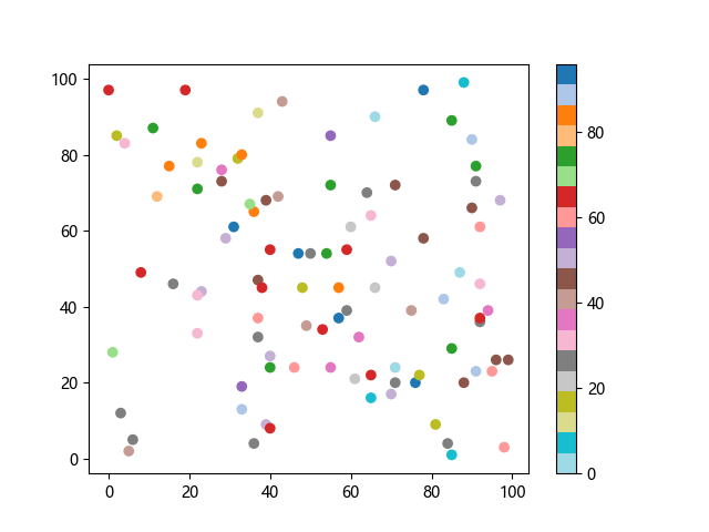 # 以下三行代码使编译器支持绘图功能: import sys import matplotlib matplotlib.use('Agg') import matplotlib.pyplot as plt import numpy as np # 生成随机数据: x = np.random.randint(100, size=(100)) y = np.random.randint(100, size=(100)) colors = np.random.randint(100, size=(100)) # 使用 tab20 反向离散配色方案创建散点图: plt.scatter(x, y, c=colors, cmap='tab20_r') plt.colorbar() plt.show() # 以下两行代码使编译器能够输出图形: plt.savefig(sys.stdout.buffer) sys.stdout.flush()